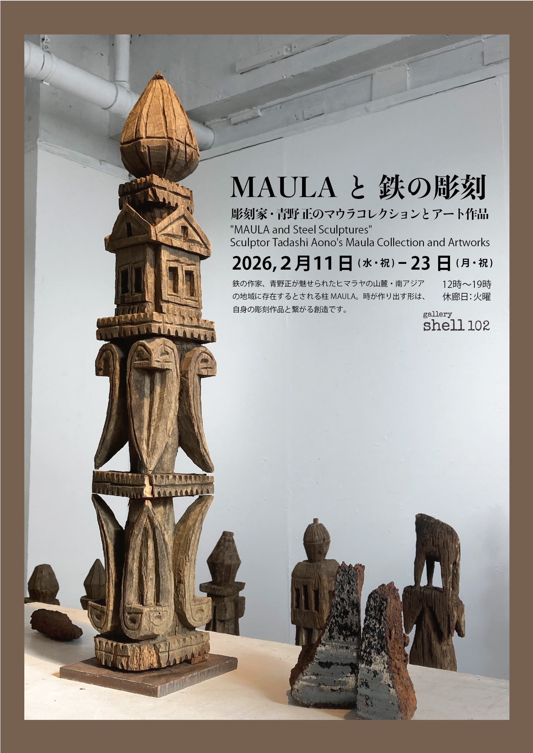 本展示は、「MAULA」に魅せられた鉄の作家、青野正のコレクションと自身の鉄彫刻の作品を並べます。